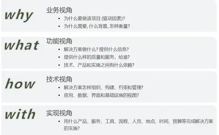 方案编写也同样有四个视角:业务视角、功能视角、技术视角、实现视角。