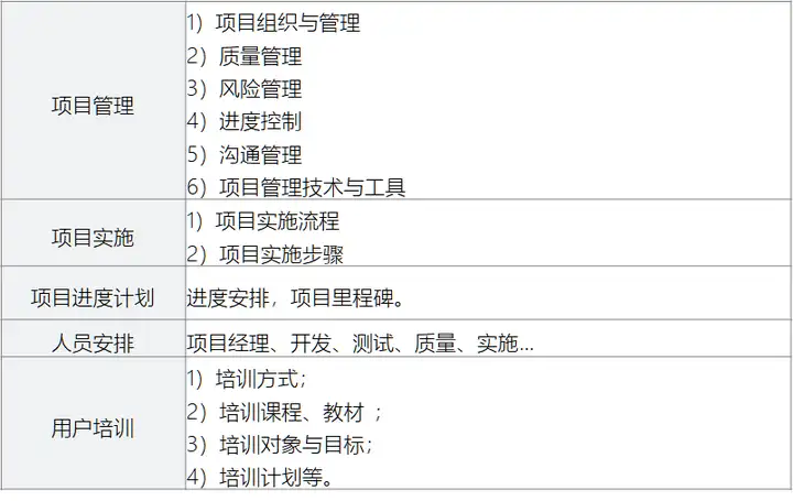 一般包括项目管理、项目实施、项目进度计划、人员安排、用户培训等。