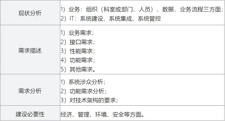 一般包括现状分析、需求描述、需求分析和建设必要性,见下表: