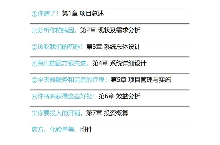 解决方案的谋篇布局与上面看病的例子类似。内容一般由项目总述、现状及需求分析、系统总体设计、系统详细设计、项目管理和实施、效益分析、投资概算和附件等组成。