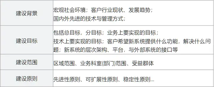 一般包括建设背景、建设目标、建设范围和建设原则,见下表: