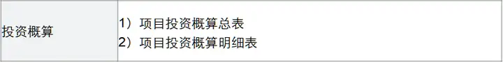包括项目投资概算总表和项目投资概算明细表,有的需要附上投资依据。
