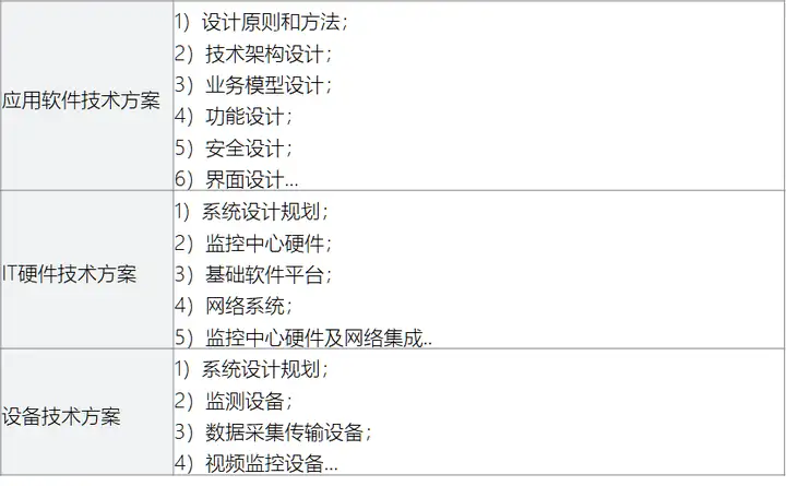 一般包括应用软件技术方案、IT硬件技术方案、设备技术方案、基础平台技术方案等,见下表: