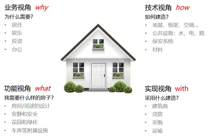 比如你要建造一座房子,你会先去找谁?是找瓦工、室内设计师,还是厨房供应商呢?当然都不是。你需要去找一个建筑师。建筑师会根据你的需求,设计房屋图纸。建筑师知道要问什么问题,如何组织这些问题,并且他可以从括业务、功能、技术和实现四个视角为你提供关于房屋建造的有用知识。