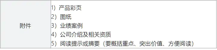 一般包括产品彩页、图纸、业绩案例、公司介绍及相关资质、阅读提示或摘要等。