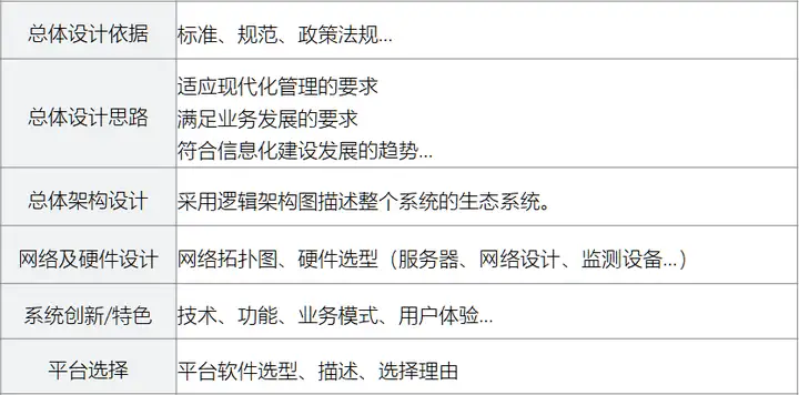一般包括设计依据、设计思路、架构设计、网络及硬件设计、系统创新/特色、平台选型等,见下表: